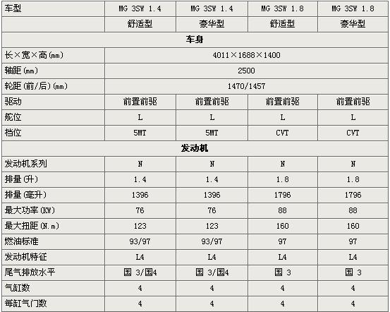 名爵MG 3SW車身長4011mm、寬1688mm、高1400mm,比天語SX4略小一些,軸距與SX4相同。新車搭載1.4L、1.8L兩個(gè)系列發(fā)動(dòng)機(jī),其中1.4L發(fā)動(dòng)機(jī)最大功率76kw,最大扭矩123Nm,排放達(dá)到國4標(biāo)準(zhǔn)。