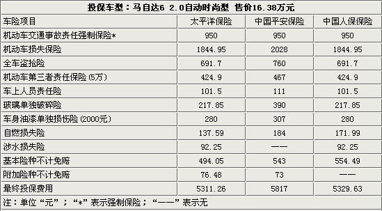 馬自達(dá)6(參數(shù)配置 圖庫)作為一汽馬自達(dá)旗下的主力車型,自上市以來一直深受消費(fèi)者的喜愛。近日馬自達(dá)為進(jìn)一步加大馬自達(dá)6車系的價(jià)格區(qū)間,增強(qiáng)整體競爭力而推出的兩款新車——馬自達(dá)6轎車時(shí)尚版與運(yùn)動(dòng)版轎跑車,已于2008年7月初上市銷售。對于消費(fèi)者而言,在購?fù)贶嚭蟪松吓浦庾畲蟮囊患戮褪墙o愛車上保險(xiǎn)了,而目前市面上大大小小的保險(xiǎn)公司有幾十家,消費(fèi)者究竟要如何選擇呢?下面我們就以新馬自達(dá)6自動(dòng)時(shí)尚型為例,分別收集了目前市場上三家比較知名保險(xiǎn)公司的投保費(fèi)用(中國平安、中國人保、太平洋保險(xiǎn)),以便消費(fèi)者可以在提車后選擇適合自己的保險(xiǎn)公司及投保方式。