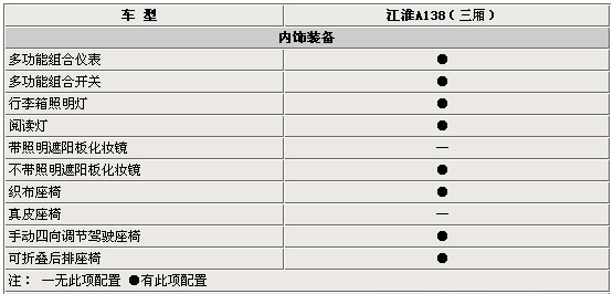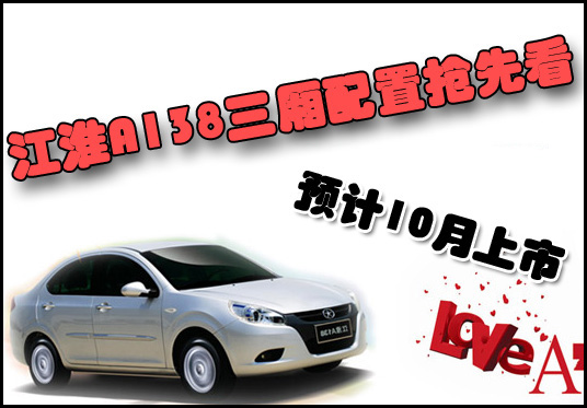 江淮汽車首款A(yù)系列家轎預(yù)計(jì)將于10月中旬左右正式上市開(kāi)始銷售,在車型上將分為A137(兩廂)以及A138(三廂)兩個(gè)系列,預(yù)計(jì)價(jià)格區(qū)間為4—7萬(wàn)元。近日,網(wǎng)上車市網(wǎng)站在江淮汽車內(nèi)部人士處得到了A138(三廂)的詳細(xì)配置,下面讓我們一同在上市前搶先了解下。
