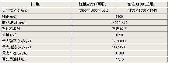 江淮A137與138均采用技術(shù)成熟可靠的三菱4G13發(fā)動(dòng)機(jī),排量為1.3L,最大功率達(dá)到了69Kw,最高車速超過(guò)160km/h,排放為歐IV標(biāo)準(zhǔn),百公里油耗小于5.5升。兩款車除了車身長(zhǎng)度以及整備質(zhì)量略有區(qū)別外,其它參數(shù)基本相同。