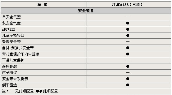 雖然江淮A系車型為價(jià)格偏低的緊湊型家轎,但是在安全裝備方面完全可以與一般的中級(jí)合資車型相媲美。雙安全氣囊、ABS+EBD、倒車?yán)走_(dá)等配置一應(yīng)俱全。