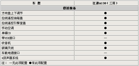 在舒適裝備方面,A138(三廂)體現(xiàn)了實(shí)用為主的理念。方向盤可調(diào)節(jié)、車內(nèi)控制油箱蓋開(kāi)啟、機(jī)械手動(dòng)空調(diào)以及單碟CD音響基本上能滿足購(gòu)買這一級(jí)別車型消費(fèi)者對(duì)舒適性的要求。
