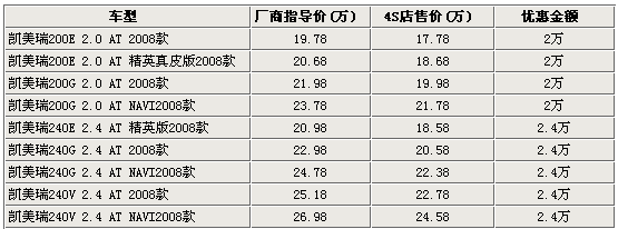隨著新款車型上市時(shí)間的日益臨近,目前銷售的08款凱美瑞價(jià)格出現(xiàn)了松動(dòng)。據(jù)網(wǎng)上車市價(jià)格監(jiān)測(cè)系統(tǒng)顯示,目前在許多地區(qū)的廣汽豐田4S店購(gòu)買08款凱美瑞系列車型,最高可以享受到2.4萬(wàn)元的現(xiàn)金優(yōu)惠。