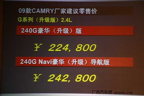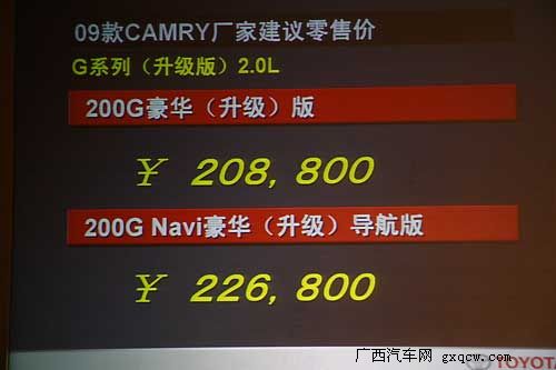 9月22日下午廣州豐田正式向市場推出09款凱美瑞(參數(shù)配置 圖庫),本次共發(fā)布4款車型,價格分別為:200G豪華(升級版)208800元、200G Navi 豪華(升級)導(dǎo)航版 226800元、240G豪華(升級版)224800元、240G Navi 豪華(升級)導(dǎo)航版 242800元。