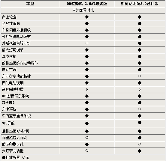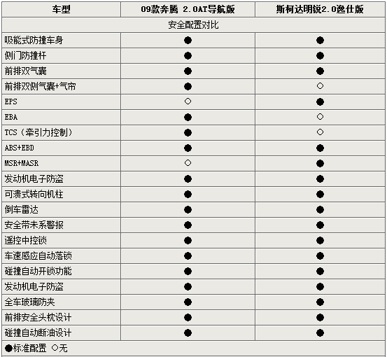 在安全配置方面,通過圖表可以發(fā)現(xiàn):兩車均擁有較多的安全配置及設計,而增配后的09款奔騰憑借更細致的設計以及更低的價格優(yōu)勢將左右消費者的選擇。作為同為定價不高的車型,兩者能為消費者想到更多,實在是不易,為眾多同級別車型作出了榜樣。
