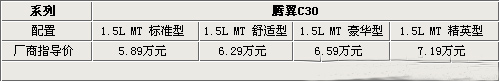 為體現(xiàn)精品超值,騰翼C30的各車型最低配置突出代步工具的實(shí)惠。舒適型配置都有全鋁VVT發(fā)動機(jī)、雙安全氣囊、ABS+EBD、四輪盤剎、CD+Mp3、四門電動車窗、安全帶未系報(bào)警、車門未關(guān)報(bào)警系統(tǒng)、鑰匙未拔報(bào)警系統(tǒng)及發(fā)動機(jī)電子防盜。而最高配置面對精英用戶,則有電動天窗、真皮電加熱座椅、自動空調(diào)等,更是體現(xiàn)了騰翼C30的精品形象。