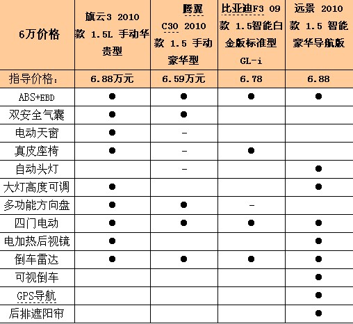 舒適方面,如果以旗云3的6.88萬元華貴型作為比較,那么它的舒適配置很齊全,電動車窗,行車電腦顯示屏,倒車?yán)走_(dá),真皮座椅,多功能方向盤,后視鏡加熱一應(yīng)俱全。對比來看,騰翼C30沒有真皮座椅,沒有電動天窗等等,性價(jià)比并不是特別高。比亞迪F3的6.78萬元舒適配置不是太齊全。作為比對來說應(yīng)該會有些吃虧,不過7.08萬元這款性價(jià)比是很高的。遠(yuǎn)景2010款主要賣點(diǎn)是GPS導(dǎo)航+可視倒車,除此之外后風(fēng)擋遮陽簾,自動頭燈以及大燈高度可調(diào)也是舒適賣點(diǎn)。
