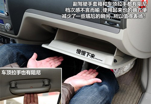 車內(nèi)雖然不如外面那么吸引人,顯得有些中庸和保守,但是實(shí)用性并不差。很多細(xì)節(jié)都能夠體現(xiàn)人性化的理念,比如帶有阻尼的手套箱,在自主品牌的同級(jí)別車?yán)锞秃苌僖,甚至車頂(shù)睦忠餐瑯訋в凶枘帷в姓彰鳠舻恼陉柊寤瘖y鏡,雖然也是小東西,但確實(shí)給人的感覺不一樣。