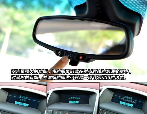 通用配備的安吉星是個(gè)十分貼心的配置,它主要通過(guò)后視鏡和中控顯示屏實(shí)現(xiàn)。這套安吉星系統(tǒng)借助GPS全球衛(wèi)星定位系統(tǒng)和無(wú)線通信技術(shù),別看小小的行車顯示屏,在安吉星啟動(dòng)時(shí)會(huì)出現(xiàn)導(dǎo)航鍵頭來(lái)提示駕駛者應(yīng)走的行車路線,同時(shí)也為車主提供“碰撞自動(dòng)求助”、“緊急救援”等六大類14項(xiàng)服務(wù)。安吉星OnStar全時(shí)在線助理系統(tǒng)的引入,不僅操作簡(jiǎn)單,而且非常具有實(shí)用性。