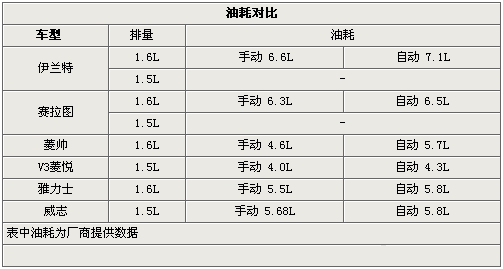 除了在購車時的優(yōu)惠以外,在日常的使用中,相對小的排量也會在燃油經(jīng)濟性上擁有一定優(yōu)勢。表中可以看出,東南汽車菱帥車型搭載1.6L發(fā)動機手動版油耗為4.6,自動版油耗為5.7L,V3菱悅作為代替它的車型,搭載一款1.5L發(fā)動機,4.0L/4.3L的平均油耗進步很明顯。伊蘭特和塞拉圖兩款車型曾放出消息稱會推出搭載1.5L發(fā)動機的車型,但因為目前尚未推出,廠商還未能提供有數(shù)據(jù)。
