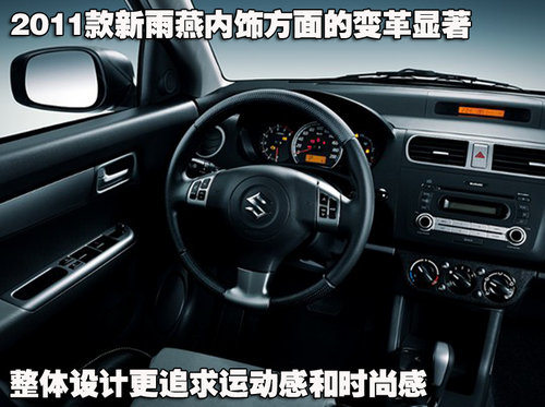 除以上主要革新特點(diǎn)外,雨燕2011款還通過對(duì)空調(diào)出風(fēng)口增加銀色裝飾件、雙色搭配時(shí)尚門板等多項(xiàng)升級(jí),增加了內(nèi)飾的運(yùn)動(dòng)氣息和更加飽滿的美感。