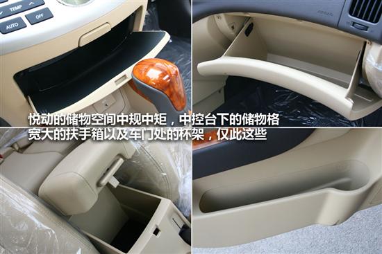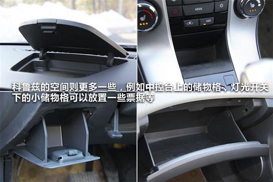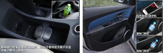 最后來看看儲物空間,悅動在這方面就表現的有些中規(guī)中矩了,中控臺下的儲物格、寬大的扶手箱以及車門處的杯架,僅此這些;科魯茲的空間則更多一些,除了悅動的上述位置外,科魯茲在中控臺上面還設計了儲物格,燈光開關下的小儲物格可以放置一些票據等,此外科魯茲的杯架較深,并且可以調節(jié),所以不管你是大瓶還是小瓶都可放穩(wěn)當。