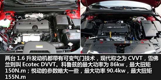 兩臺(tái)1.6升發(fā)動(dòng)機(jī)都帶有可變氣門技術(shù),現(xiàn)代稱之為CVVT,雪佛蘭則叫Ecotec DVVT,因此在科技含量方面可以說(shuō)是不相上下?启斊澋淖畲蠊β蕿86kw,最大扭矩150N.m;悅動(dòng)的參數(shù)略大一些,最大功率90.4kw,最大扭矩155N.m。
