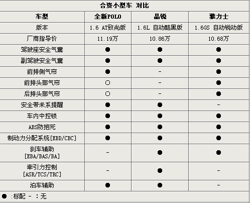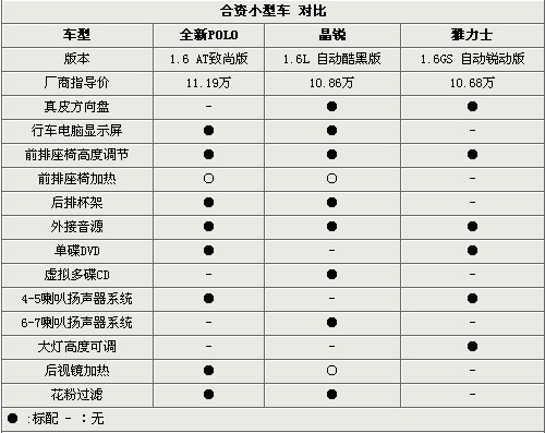 配置部分根據(jù)價格高低的差別,兩款大眾集團車型優(yōu)勢相對明顯。全新POLO優(yōu)勢在于裝備有后視鏡加熱功能;酷黑版晶銳在娛樂系統(tǒng)表現(xiàn)出眾,虛擬多碟CD配合6-7個揚聲器系統(tǒng),給予使用者更多的耳邊愉悅;雅力士是三款車型中售價最低的一款,在配置上沒有自己獨到的優(yōu)勢,表現(xiàn)相對平庸。