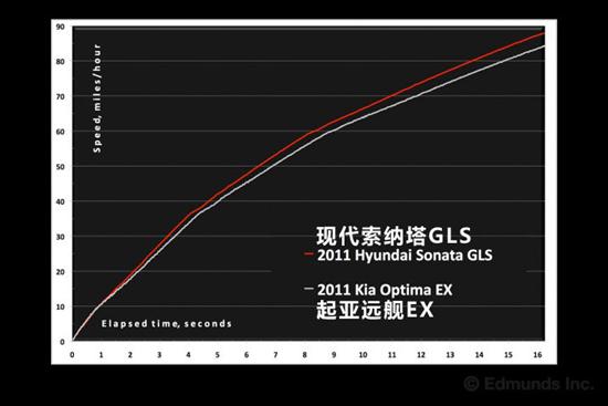 四分之一英里加速成為了兩款車的第一個(gè)比拼項(xiàng)目。在發(fā)動(dòng)機(jī),變速箱及最終傳動(dòng)比均一樣的條件下,輪胎抓地力和車重成為了影響成績的重要因素。兩者同時(shí)沖出起跑線,并且齊頭并進(jìn)沖向終點(diǎn)。當(dāng)車速達(dá)到48公里/小時(shí)后,索納塔開始以微弱的優(yōu)勢(shì)領(lǐng)先;速度超過96公里/小時(shí)后,索納塔領(lǐng)先優(yōu)勢(shì)日漸明顯,并且最終以領(lǐng)先遠(yuǎn)艦0.5秒的成績完成首輪較量。從數(shù)據(jù)圖中可以發(fā)現(xiàn)兩者在加速初段幾乎完全一樣,隨著速度的提升,起亞的加速能力上開始處于下風(fēng)。當(dāng)然,這與發(fā)動(dòng)機(jī)和變速箱的表現(xiàn)無關(guān)。更寬的輪胎和重量上的差異才是導(dǎo)致這種局面的主要原因。