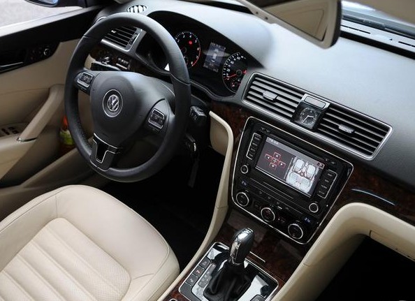 新帕薩特采用了全黑和雙色兩種配色方案,全黑內(nèi)飾更偏重于運(yùn)動(dòng)風(fēng)格,而雙色內(nèi)飾則更偏重商務(wù)。內(nèi)飾用料上采用了真皮、仿木和金屬三種質(zhì)感的材質(zhì),整體做工水平較高。方向盤(pán)采用了全黑真皮包裹的三輻設(shè)計(jì),手感不錯(cuò),并配有多功能按鍵,可控制音響和免提電話以及行車電腦的菜單操作。而定速巡航功能的操作則設(shè)計(jì)在了方向盤(pán)后方左邊的操縱桿上。燈光的控制旋鈕依舊位于左側(cè)空調(diào)出風(fēng)口下方,前大燈可感應(yīng)外部光線自動(dòng)點(diǎn)亮或關(guān)閉。新帕薩特的儀表盤(pán)采用白字+紅色指針的搭配,沒(méi)有多余的點(diǎn)綴,顯示清晰明了。在轉(zhuǎn)速表和時(shí)速表的中間,配有一個(gè)3.5英寸行車電腦顯示屏。