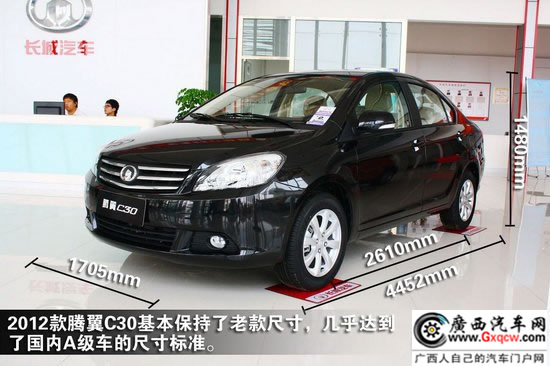 在車身尺寸與外觀方面,2012款騰翼C30基本保持了老款的設計特點,長寬高分別達到4452/1705/1480毫米,軸距也達到了2610毫米,幾乎達到了國內(nèi)A級車的尺寸標準。另外,騰翼C30的離地間隙達到155毫米,可以適應國內(nèi)復雜路面情況。外觀方面的最大變化則來自于前臉部分的造型上,新款車型將進氣格柵由原來的“四道杠”改成了“三道杠”。 這是因為長城需要對品牌設計元素進行統(tǒng)一。