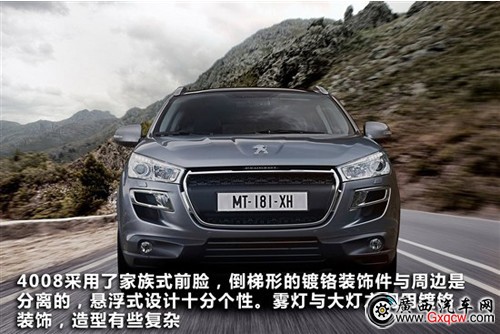 外觀上,4008借鑒了2010年在巴黎車展發(fā)布的HR1 Concept概念車的造型,這款概念車的設(shè)計(jì)得以繼承。前臉采用家族式的設(shè)計(jì),倒梯形狀的進(jìn)氣格柵用鍍鉻裝飾,鍍鉻條四周有間隙,這種懸浮式的設(shè)計(jì)很具個(gè)性。