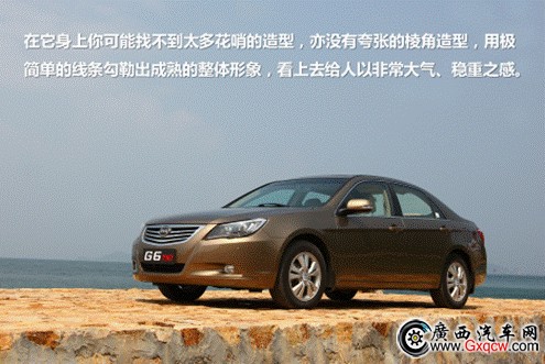 在G6身上你可能找不到太多花哨的造型,亦沒有過分夸張的棱角造型,而只是用極其簡單的線條勾勒出成熟的整體外觀形象,看上去給人以非常大氣、穩(wěn)重之感。同時,全車采用日本荻原模具廠出品的模具,在精細度方面已經(jīng)完全超越了以往人們對于自主品牌的認知。