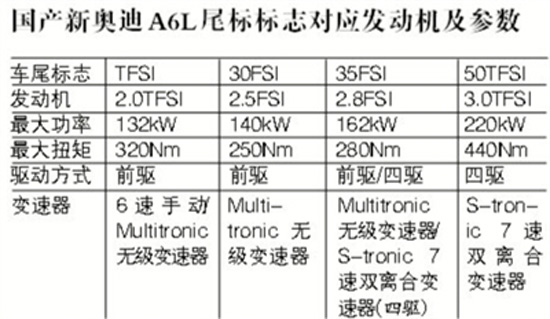 新奧迪A6L除了延續(xù)之前2.0TFSI、2.8FSI和3.0TFSI三種汽油發(fā)動(dòng)機(jī)之外,還為中國(guó)市場(chǎng)專門推出了2.5FSI直噴發(fā)動(dòng)機(jī),該發(fā)動(dòng)機(jī)是基于2.8FSI發(fā)動(dòng)機(jī)開發(fā),用以全面替代上一代奧迪A6L中的2.4L發(fā)動(dòng)機(jī)。最大功率140kW(較老款2.4L增加10kW),最大扭矩250Nm(增加20Nm),配合8速M(fèi)ultitronic無(wú)級(jí)變速器(四驅(qū)版采用7速雙離合變速器),官方給出的綜合油耗僅為7.5L/100公里。
