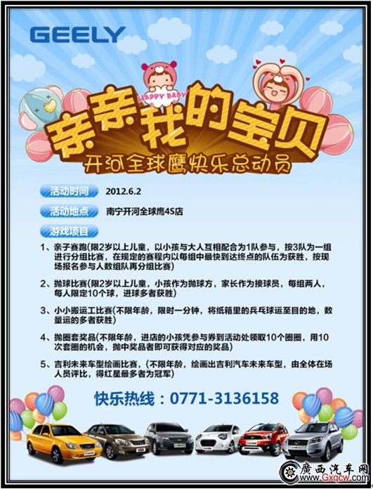 6.2日,南寧開河全球鷹4S店邀約加入,親親我的寶貝--全球鷹六一節(jié)快樂總動員在這里快樂揚帆。只要你童心未泯,只要你享受童年的樂趣,帶上您的寶寶來到開河全球鷹4S店過個快樂的六一兒童節(jié);顒犹卦O購車夜場,購車夜場最高鉅惠19800萬元。