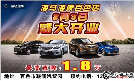 廣西海馬?蛋偕陮⒂2月3日在百色市聯(lián)潤(rùn)汽貿(mào)園盛大開業(yè)。海馬汽車全系車型將悉數(shù)登場(chǎng),抄底震撼等您來,最高直降1.8萬元優(yōu)惠。您還等什么,趕緊行動(dòng)吧。您只需要通過網(wǎng)絡(luò)報(bào)名 或 “報(bào)名熱線”:13978626912 報(bào)名就可獲精美禮品一份。