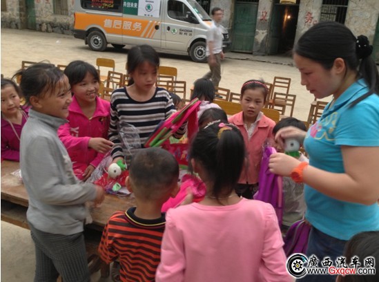 一路經(jīng)過5個(gè)小時(shí)奔波到達(dá)巴馬縣城,再驅(qū)車走曲折盤旋的山區(qū)小路一個(gè)半小時(shí),步行20多分鐘,于16時(shí)抵達(dá),一個(gè)四面處于環(huán)山低谷山區(qū)的本次捐贈(zèng)助學(xué)的小學(xué)—弄京小學(xué)。車主們不辭辛勞,大人小孩一起上到物資貨運(yùn)車,把愛心助學(xué)物品搬下車,捐贈(zèng)給學(xué)校校長,并給小朋友一一發(fā)放書包和紅領(lǐng)巾,召號鼓勵(lì)孩子們好好學(xué)習(xí)。其中10號車的敬女士,除了為孩子們帶去學(xué)習(xí)用具等物品外,還想得特別周到,給小朋友帶去卡通小公仔,小女孩用的漂亮發(fā)夾、發(fā)圈,并一一幫小女孩戴上發(fā)圈。敬女士說,她身為兩個(gè)孩子的母親,深知山里留守兒童除了缺少學(xué)習(xí)用品,還缺少父母親的關(guān)愛。她希望通過她的點(diǎn)滴細(xì)微行為,能給小朋友帶來心靈上的關(guān)愛和溫暖。