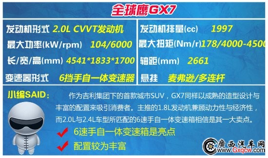 車型簡介:外觀設計方面,GX7將作為全球鷹的首款SUV車型而被推出,外觀設計方面采用了相對年輕化的元素,中網(wǎng)格柵、黑色前后防擦板以及重新設計的尾燈都是吉利設計師在設計語言上的最新詮釋。