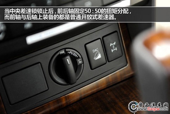 日常駕駛時為全時四驅(qū)狀態(tài),扭矩以前40后60的比例分配,在遇到打滑情況時,前、后軸的扭矩分配比最大可達到29:71。當中央差速鎖鎖止后,前后軸固定50:50的扭矩分配,而前軸與后軸上裝備的都是普通開放式差速器。