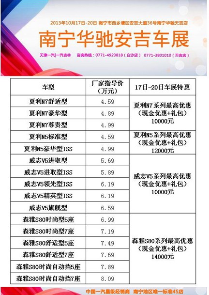 2013年10月17日-20日,2013年廣西第22屆汽車交易會(huì)盛大開幕,中國(guó)一汽南寧華馳攜明星車型夏利N7、夏利N5、威志V5、森雅S80等車型閃耀在安吉大道36號(hào)天吉店(安吉車展正對(duì)面)。為回饋廣大客戶對(duì)南寧華馳近十年來的支持與關(guān)注,車展期間參展車型大放價(jià)!購(gòu)車即享現(xiàn)金直降+禮包(送價(jià)值3080元的三年或6萬(wàn)公里常規(guī)保養(yǎng)、送2000元油卡、送精品等),優(yōu)惠高達(dá)14000元,價(jià)格絕對(duì)超乎想象!更多優(yōu)惠驚喜歡迎您來現(xiàn)場(chǎng)探尋!優(yōu)惠僅限車展期間,逾期不候。