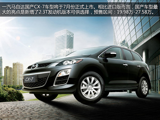 一汽馬自達國產(chǎn)CX-7車型將于今年7月份正式上市。相比進口版而言,國產(chǎn)車型最大的亮點是新增了2.3T發(fā)動機版本可供選擇,預(yù)售價格區(qū)間:19.98萬元—27.58萬元。