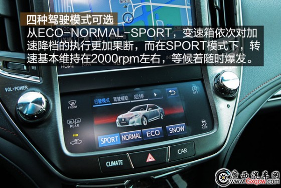 2.0T的車型上同樣提供了ECO、NORMAL、SPORT、SNOW四種駕駛模式選項(xiàng),在SPORT模式下,轉(zhuǎn)速基本維持在2000rpm左右,等候著隨時(shí)爆發(fā);而NORMAL模式下,變速箱無(wú)論升降擋都表現(xiàn)十分積極。從ECO-NORMAL-SPORT,變速箱依次對(duì)加速降檔的執(zhí)行更加果斷,不過(guò)總體的反應(yīng)要比寶馬2.0T上搭載ZF的8AT要稍慢,不過(guò)對(duì)于舒適偏向的皇冠完全可以接受,畢竟提供的運(yùn)動(dòng)模式就足以滿足絕大多數(shù)人的需要