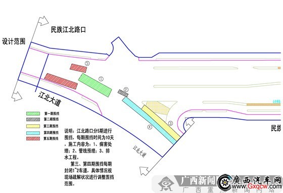 民族大道江北大道路口:對路口的病害區(qū)域進行圍擋,范圍分布在路口的東西方向,分5次圍擋,具體范圍詳見交通疏解圖。占道工期:從2016年5月16日到2016年7月4日,每期圍擋時間為10天,合計50天。