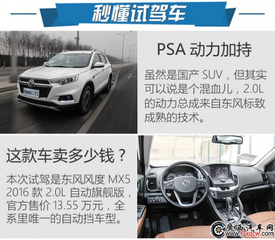 雖然是國產(chǎn)SUV,但其實可以說是個混血兒,2.0L的動力總成來自東風(fēng)標(biāo)致成熟的技術(shù)。本次試駕是東風(fēng)風(fēng)度MX5 2016款 2.0L 自動旗艦版,官方售價13.55萬元,全系里唯一的自動擋車型。
