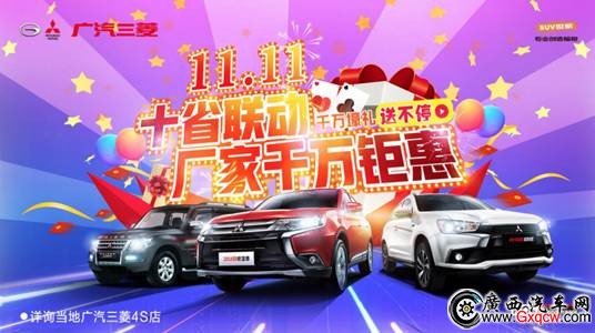 一場(chǎng)購(gòu)車狂歡,一次超值盛惠,千萬(wàn)壕禮,嗨爆雙11,就在這個(gè)11月11日,廣汽三菱“十省聯(lián)動(dòng),廠家千萬(wàn)鉅惠”團(tuán)購(gòu)會(huì),等你來(lái)嗨!想要更多驚喜和優(yōu)惠,還不開(kāi)始攢菱豆、速報(bào)名?