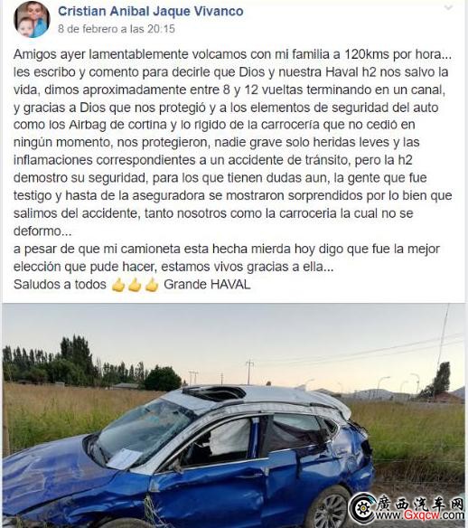回憶起側(cè)翻事故,克里斯蒂安仍心有余悸。他告訴記者:當?shù)貢r間2月8日,他駕駛愛車哈弗H2以120km/h的速度(當?shù)胤稍试S的速度)載著家人結(jié)束度假回家,途徑智利南部一段高速路上一個彎道處,突然遇到障礙物,他不得不緊急轉(zhuǎn)向,慌亂中導致車輛失控,車輛至少翻滾8周,跌入了路旁的溝里停止了翻滾。在發(fā)生事故的第一時間,車輛安全氣囊全部打開,最大程度減少了對車內(nèi)成員的傷害。幾乎沒有變形的車身令他驚嘆不已,充分維持住了車內(nèi)乘員的安全空間。整車的安全品質(zhì)超乎想象。