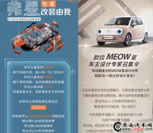 緊貼車主用車場(chǎng)景,長(zhǎng)城汽車推出一系列車主專家活動(dòng)。今年6月,哈弗百萬積分征集車主改裝專家活動(dòng)成功點(diǎn)燃車輛改裝愛好者的熱情;10月歐拉的“MEOW星”車主設(shè)計(jì)大賽邀請(qǐng)用戶共話設(shè)計(jì)美學(xué),也在用戶中獲得了極高的贊譽(yù)和強(qiáng)烈的反響,為長(zhǎng)城汽車的用戶共創(chuàng)進(jìn)一步蓄力賦能。