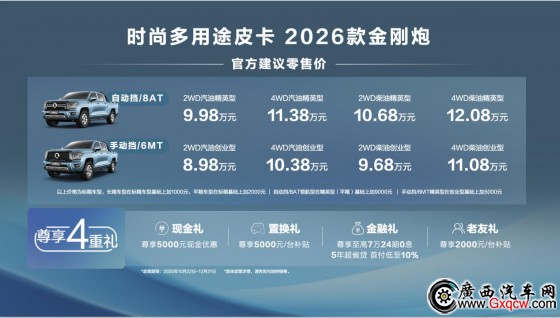 金剛炮8AT車型,官方建議零售價(jià)9.98萬元起;金剛炮6MT車型,官方建議零售價(jià)8.98萬元起。并同步推出5000元現(xiàn)金禮、5000元置換禮、2000元老友禮以及7萬24期0息金融補(bǔ)貼四重豪禮。