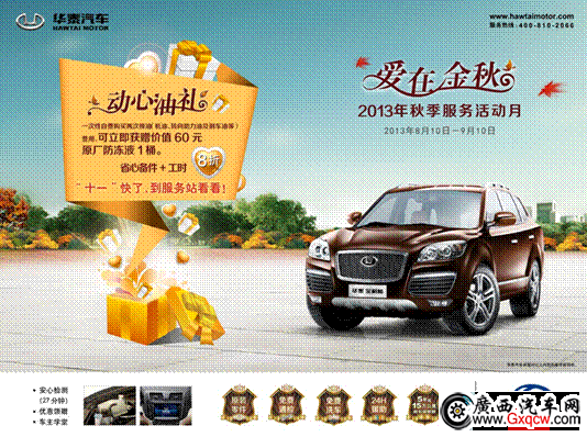 再加上經(jīng)過一夏的日曬雨淋,愛車不論外觀還是內(nèi)里,都受到一定損害,假期出行前對其進(jìn)行檢測保養(yǎng)極有必要。為感恩回饋廣大車主的厚愛,從8月10日起至9月10日止的一個月內(nèi),2013年華泰汽車秋季全心服務(wù)活動在全國近300家服務(wù)商店展開超值的“換油+1”服務(wù),更可收獲多重驚喜優(yōu)惠。