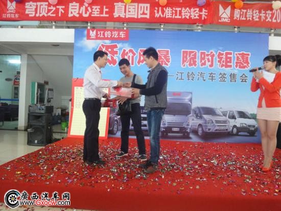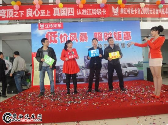 3月28日周六上午廣西江鈴汽車在4S 店內(nèi)舉行江鈴汽車各車系簽單會,并推出開春超值促銷優(yōu)惠,吸引來江鈴眾多新老客戶朋友的關(guān)注。同時(shí),當(dāng)天活動(dòng)現(xiàn)場江鈴伙伴為客戶朋友們精心準(zhǔn)備各種互動(dòng)環(huán)節(jié)也深受在場客戶朋友的喜愛,然而,面對誘人的優(yōu)惠政策來參與活動(dòng)的朋友也是紛紛在訂車榜上簽訂車信息。*后,簽單會以較好的訂單量取得圓滿成功。