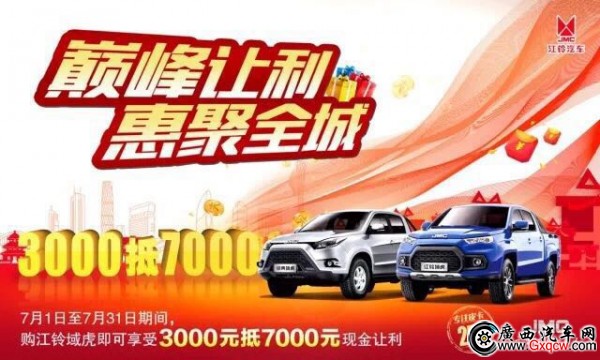 6月活動(dòng)已經(jīng)結(jié)束,7月優(yōu)惠持續(xù)不斷哦!7月1日—7月31日,購(gòu)江鈴域虎享3000元抵7000元現(xiàn)金優(yōu)惠!另外江鈴寶典也官降4000元哦!還沒(méi)有買到車的朋友,速速來(lái)訂購(gòu)吧!! !