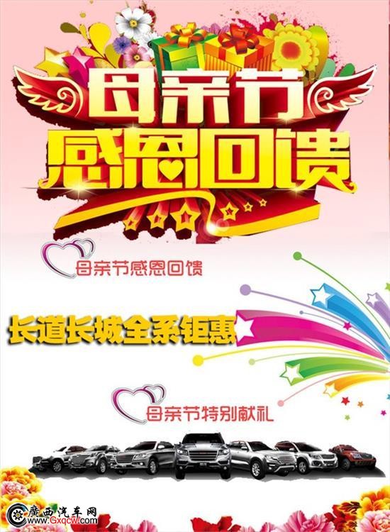 無論你是在奮斗的路上,還是開啟了事業(yè)、擁有了家庭,一輛宜商宜家的全能座駕定能助你一臂之力,長道長城汽車為您構筑的全新生活方式。5月11日廣西長道將舉行母親節(jié)真情回饋活動,全系促銷匯,活動期間購車享鉅惠價、訂車送親子大禮包。