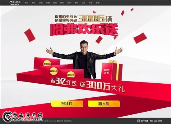 為慶祝哈弗SUV銷(xiāo)量率先突破300萬(wàn)輛,哈弗推出“慶祝哈弗SUV銷(xiāo)量率先突破300萬(wàn)輛,感恩歡樂(lè)送——派3億紅包,送300萬(wàn)大禮”的感恩活動(dòng),來(lái)答謝廣大用戶(hù)。哈弗H2車(chē)型紅包持續(xù)派發(fā)中,紅包金額直減車(chē)價(jià),還不來(lái)?yè)?