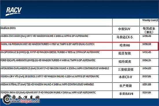 RACV通過詳細的分析對比,評選出各品類中的“最具價值的車型”。其中在中型SUV品類中,哈弗H6 Coupe憑借整車價格、保值率、維修保養(yǎng)、及油耗方面的優(yōu)勢,以每周用車成本190.59澳元名列第二,排名在起 亞 智 跑、福 特 翼 虎、本 田 CR-V等車型之前,僅以0.19澳元差距略高于馬 自達 CX-5(190.40澳元)。