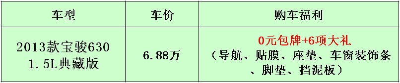 如此令人心動(dòng)的優(yōu)雅座駕,正在超值限量特供!汽貿(mào)園雙誠(chéng)寶駿2013款寶駿630 1.5L典藏版6.88萬(wàn)僅需0元特價(jià)包牌還送6項(xiàng)大禮(導(dǎo)航、貼膜、座墊、車窗裝飾條、腳墊、擋泥板)!福利車型數(shù)量僅限8臺(tái),售完即止,心動(dòng)就趕快行動(dòng)!