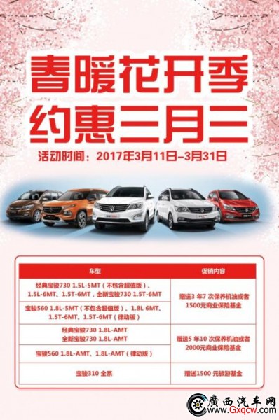 五菱寶駿暖春季,提前約惠三月三:活動期間,訂購寶駿730、寶駿560、寶駿310,可享受高達3000元暖春大禮包!