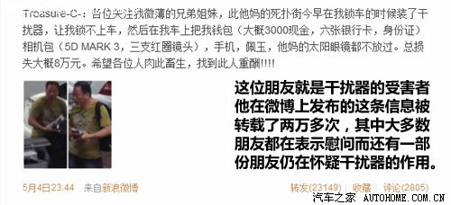 前幾天微博中一位朋友發(fā)布了一條微博,稱自己在停車時受到了干擾器的干擾車門沒有鎖住,等他辦完事兒回來后發(fā)現(xiàn)車內(nèi)的佳能5D MARK III+3支鏡頭等財物被洗劫一空,粗算損失在8萬元以上?吹竭@個微博后我在網(wǎng)上搜到一些關(guān)于干擾遙控鎖車的新聞,其中一篇文章的記者說他在做調(diào)查的時候從網(wǎng)上搜到銷售干擾器的信息并聯(lián)系到銷售者,看到這我也決定實驗一把,看看能不能找到相關(guān)的銷售信息。