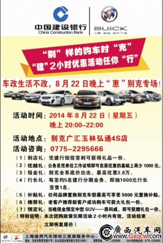 當(dāng)晚活動定車并且在8月份提車的客戶將獲贈價值千元的大禮包,更多驚喜(到店禮、定車禮、置換禮、推介禮等)盡在別克廣匯玉林弘通4S店,詳詢0775-2295666
