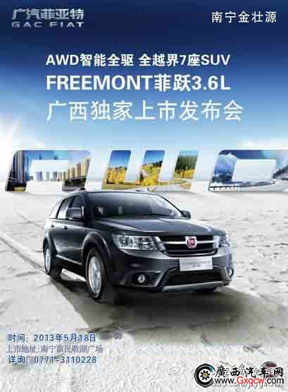 2013年5月18日晚上8點(diǎn)民歌湖廣場(chǎng),廣汽菲亞特南寧金壯源店將舉行――Freemont菲躍3.6L智能全驅(qū)版和2.4L豪華導(dǎo)航版榮耀上市發(fā)布會(huì)!繼續(xù)演繹全越界SUV掌控自由的馳騁之感!