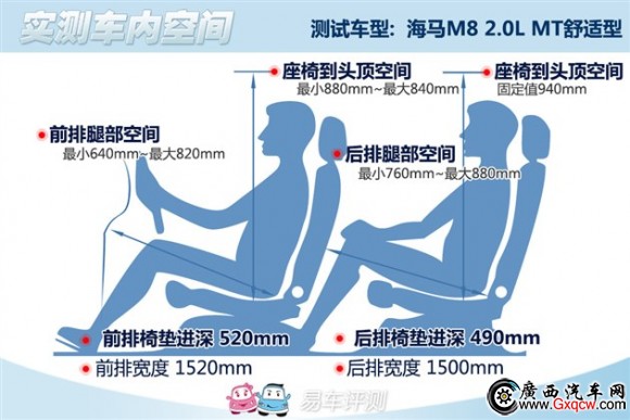 駕乘空間和空間整體實(shí)用性是考驗(yàn)一輛中級車的重要標(biāo)準(zhǔn)。海馬M8擁有2800mm的軸距,尺寸本身在同級車中具有一定的優(yōu)勢。實(shí)際表現(xiàn)也很不錯,尤其是后排的腿部空間,身高1.82米的體驗(yàn)者坐在后排,腿部距前座椅靠背尚有將近三拳的距離。**不足是后排頭部空間,由于車尾部造型的關(guān)系,留給頭頂?shù)木嚯x大約只有兩指?梢哉f是為流線的車身外觀做出了犧牲。